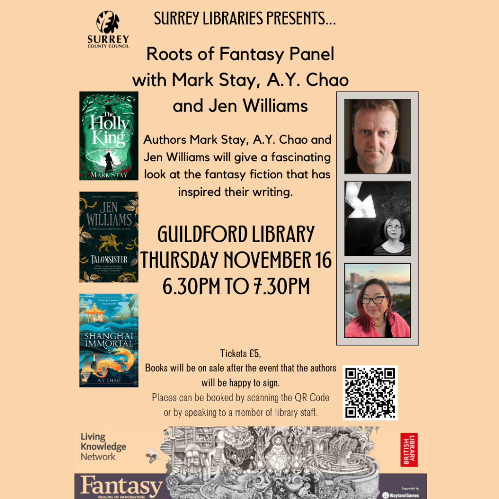 Come and join me, A.Y. Chao and Jen Williams as we take a look at the fantasy fiction that has inspired our writing. After the panel discussion, there will be a time for audience questions, then meet the authors for book sales and signing. BOOK TICKETS HERE