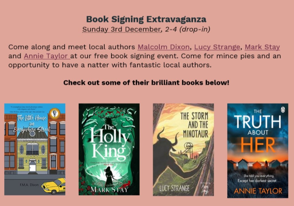 We had so much fun last year, we’re doing it again! Some fab local authors will be signing books for Christmas gifts (or why not treat yourself?). There will be mulled wine and mince pies!