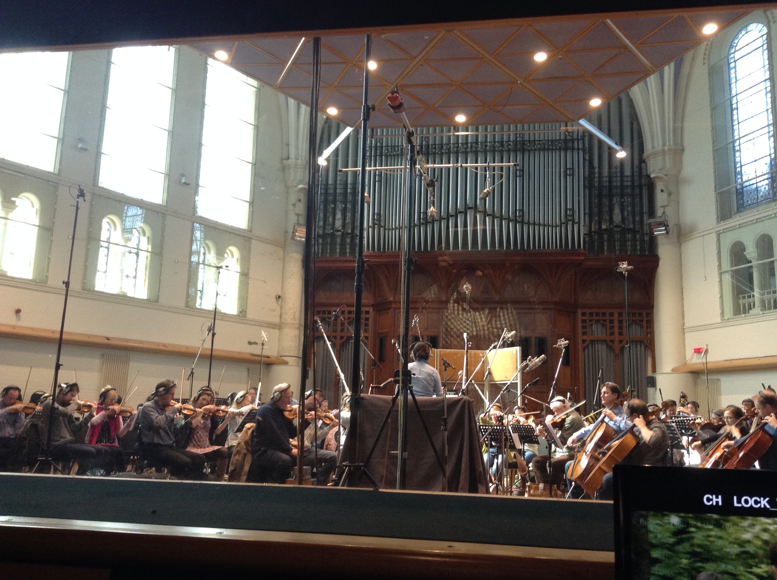 When I arrived at 9.30 most of the musicians were assembling and getting ready. I found Paddy in the studio cafe and we made our way to the sound-proofed control room room. Christian Henson (composer) and his team were raring to go. He gave a short introduction, explaining that we only had the budget for one day of recording, and there was lots to do, and then they were off.