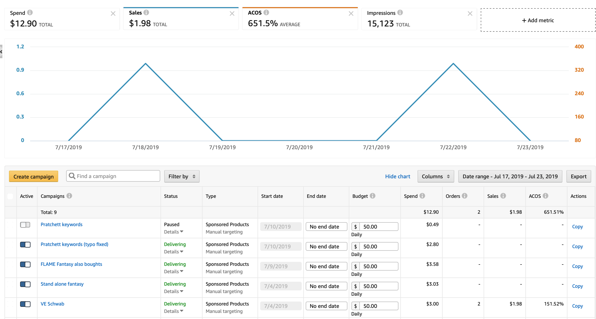 I started running ads at $10 per day, following the guidelines in the David Gaughran’s excellent book on Bookbub ads, alternating between the Abercrombie and the Barclay. Sales weren’t stratospheric — a couple a day — but they were moving again.