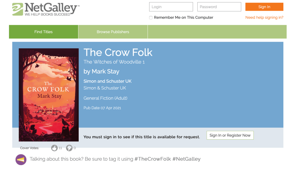 Basically, my publisher is going to touch, a couple of days ago. They had a marketing and publicity meeting, which is great because not every book gets that. So you know, you’re on your publisher’s radar if they actually gathered for a proper little meeting, which is lovely. So my editor and publicist and a marketing manager all got together. One of the first things they’ve done is they’ve put the book up on NetGalley. Now, NetGalley is a subscription service for book bloggers and journalists. So if you’re somebody who regularly reviews books, you have access to NetGalley, which is where major publishers and some independent authors meet. It costs money. I know it costs publishers thousands of pounds to put their books up on here. So you can request downloads and you can get e-book versions of books that are coming in the future so that you can download them and review them. And the publisher monitors requests. So, this isn’t just any old Yahoo who walks in off the street can download these. These are people who are bloggers and they have access. So, the right people can download the book in advance and they can put reader reviews up on things like Goodreads. Let me do the screen sharing thing if I can make this work. So hopefully you can see that now where it says up in the top corner there, NetGalley, we help books succeed and there’s “The Crow Folk, Witches of Woodville.” So if you’re a NetGalley subscriber, you log in and you download, and then you get that as an e-book to read and review. Oh, look I’ve already got 21 thumbs up, so that’s exciting.