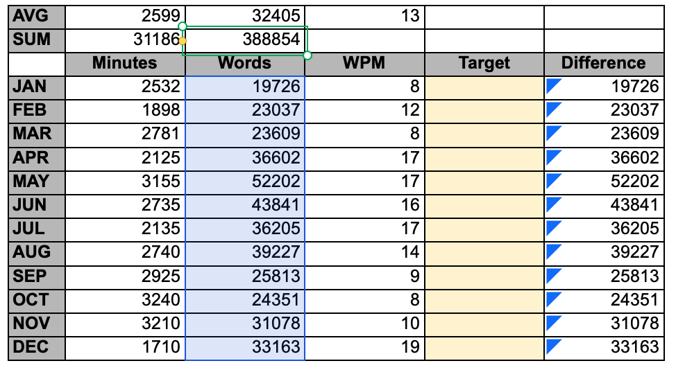 How to keep track of these words? I downloaded a simple to use spreadsheet from MoonBunny Creative’s Kofi page. In fact, I’ve just got my 2023 spreadsheet from Moonbunny here. I saved it on my desktop and popped the words in at the end of every session.